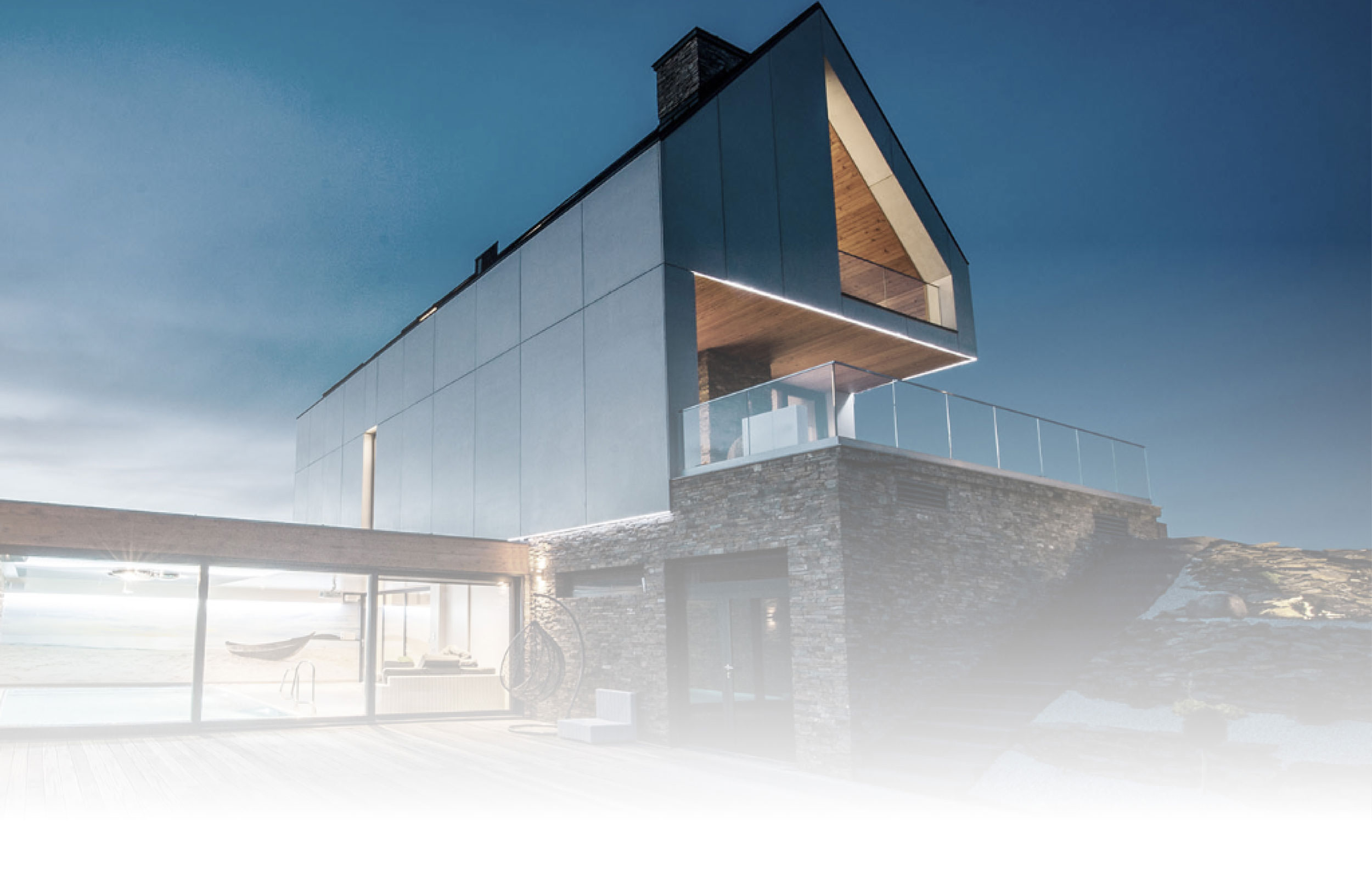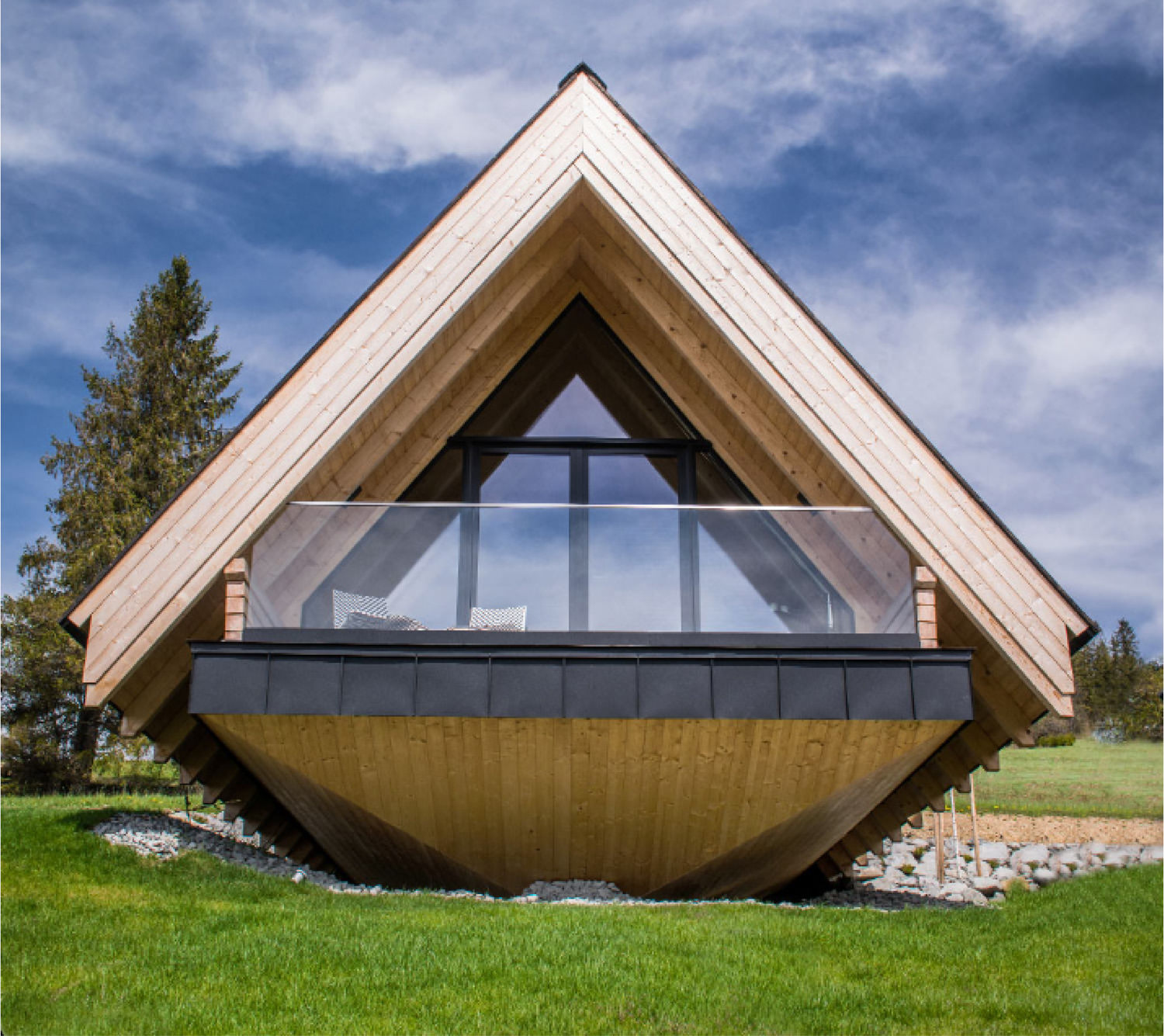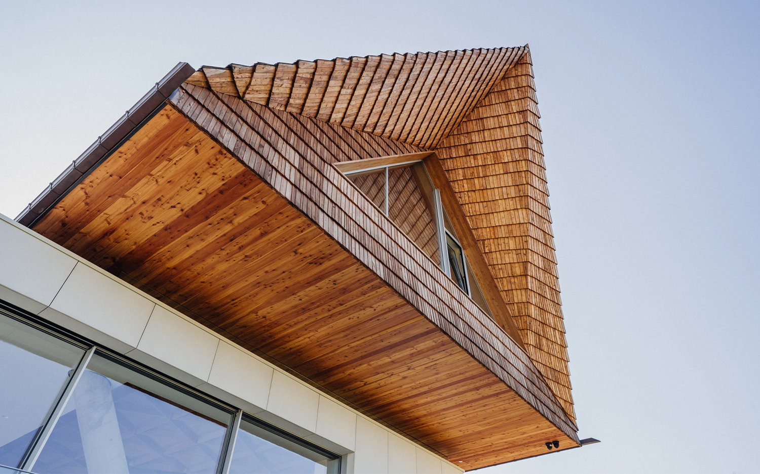 Forma stanowi współczesną interpretację „domu-stodoły” z dwuspadowym dachem. Elewacje wykończono białymi płytami z betonu architektonicznego, zestawionymi z modrzewiowym drewnem i kamieniem, co nadało bryle surowy, a zarazem szlachetny charakter. Prostą formę przełamują nadwieszenia, podcięcia i loggie, które wprowadzają dynamikę i podkreślają nowoczesny wyraz domu.